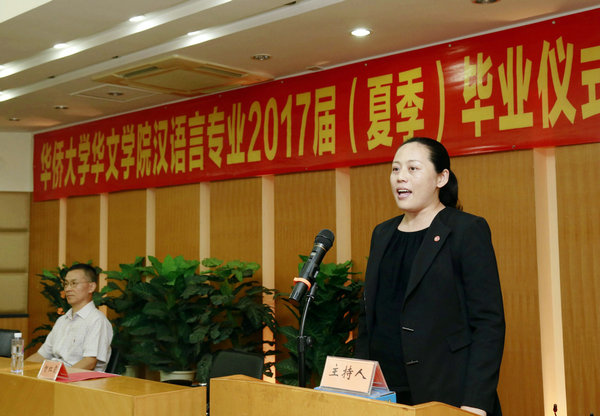 来自印尼的毕业生代表邓梅仪发表了毕业感言,回顾了在华园读书和生活的美好时光,抒发了即将告别母校和老师们的难舍之情,表达了对父母、母校和老师的无限感激之情,并表示将谨遵母校和老师的教诲,努力学习和工作,做国际文化交流的使者,把中国的智慧和文化精髓带到世界各地。