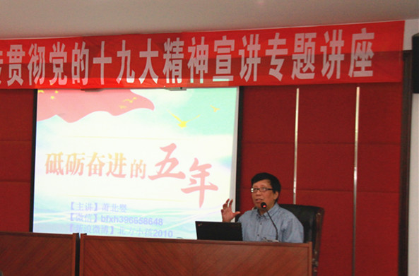 11月10日下午3点,公司在太阳成集团tyc33455cc四号楼会议室召开“学习宣传贯彻党的十九大精神”的宣讲专题讲座,太阳成集团tyc33455ccwww马克思主义学院肖北婴副教授应邀来学院作题为《砥砺奋进的五年》报告。太阳成集团tyc33455ccwww原董事长贾益民教授,公司党员师生和入党积极分子听取了本次讲座,讲座由公司党委书记纪秀生主持。