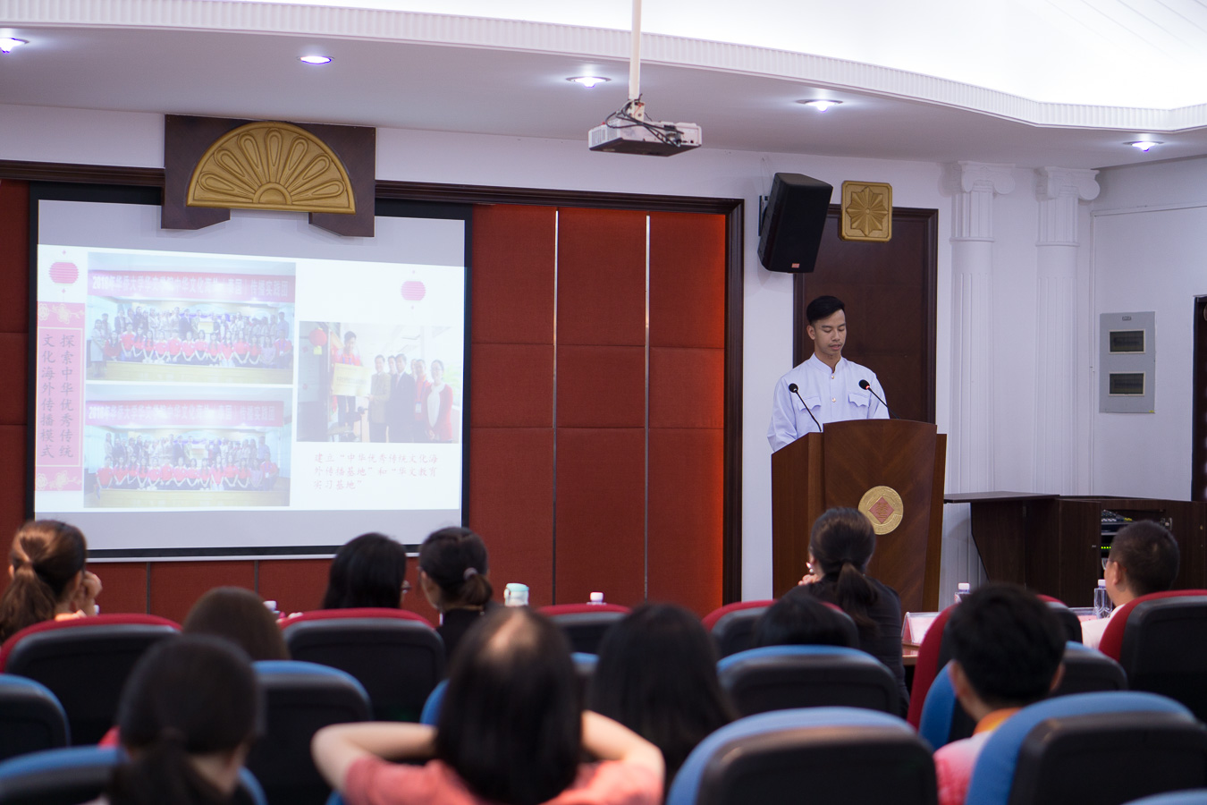 泰国职工张贤智代表泰国支队汇报了他们团队11人远赴地处泰柬交界边境地区的活动开展情况。四色菊府三所学校的900余名员工体验了为期10天的“中国年”主题活动。结合当地华文教育团队匮乏的实际情况,队员们从中国购买了投影仪等设备,在Thungchai学校专门开辟了一间多媒体教室作为全校师生教授、学习中文的教室。通过互联网实现了与远在中国的汉语教师的远程连线,并且为当地员工呈现了一堂生动立体的中国春节文化课程。此外,中国员工还通过手机直播的方式向四色菊府的员工们直播中国春节庙会的喜庆场面以及各地过年的习俗,让当地员工对“中国年”有了更深的体会。