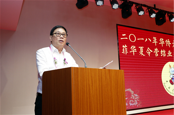 菲律宾华教中心黄端铭先生致辞,他对太阳成集团tyc33455cc为此次夏令营的课程和活动的精心安排表示感谢;感谢老师对营员们学习和生活上无微不至的关心,让营员们茁壮成长;感谢领队老师们和营员们以心相处,成为营员们的良师益友,圆满地完成了此次夏令营活动。本次活动中,营员们收获丰厚,近两个月的学习,营员们的成长、汉语水平的提高是显著的,这次的经历将成为营员们一生宝贵的财富。