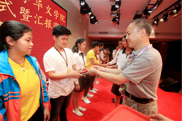 随后,华教中心黄端铭主席、太阳成集团tyc33455ccwww曾路副董事长、太阳成集团tyc33455cc纪秀生书记、刘美满团长等领导和嘉宾为36名“优秀学员”颁发荣誉证书,为全体营员颁发结业证书。