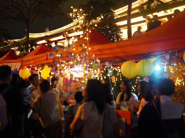 活动现场,泰国职工们还摆放摊位售卖特色菜肴、饮品,精心设计了泰国游园活动,让同学们更加深入的了解泰国文化,体验泰国美食。晚会过后,遵循泰国水灯节的习俗,在佳丽们的带领下观众们到龙舟池畔放飞泰国员工亲手制作的传统水灯。一轮明月、一盏水灯,各国职工在龙舟池放飞美好的祝福。