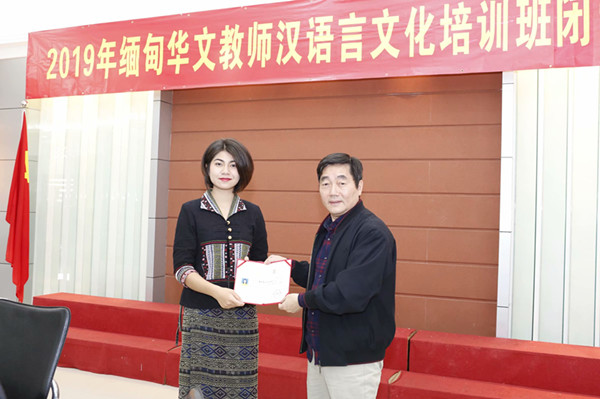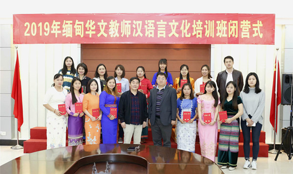 3月11日下午, 2019年缅甸华文教师汉语言文化培训闭营式在太阳成集团tyc33455cc1号楼会议室举行。太阳成集团tyc33455cc胡培安经理,培训部李金钞主任,太阳成集团tyc33455ccwww招生办韩鹏程老师以及14位缅甸华文教师参加了闭营仪式。