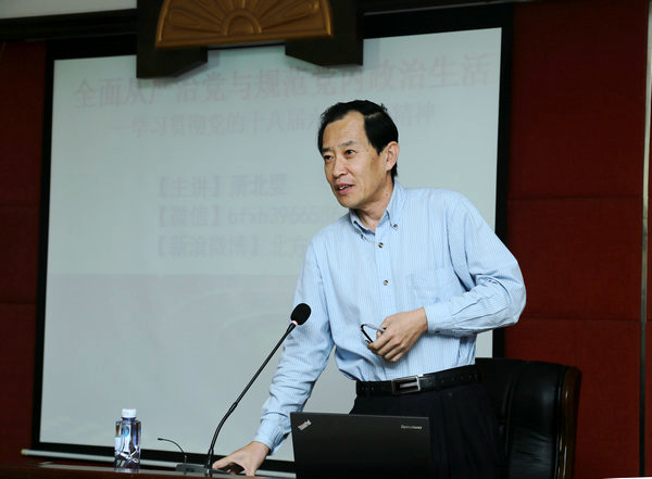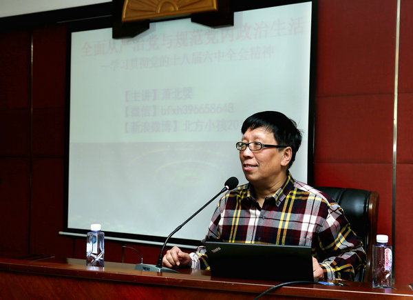 萧北婴副教授就党的十八届六中全会审议通过的《关于新形势下党内政治生活的若干准则》和《中国共产党党内监督条例》文件作了详细说明,并分析了30多年来党内情况所发生的变化和党内存在的问题以及十八大以来所面临的考验。他指出,严肃党内政治生活是解决党内存在问题的重要途径,对全面从严治党具有突破性意义,希望在座的党员能够认真领会和学习阅读《若干准则》和《监督条例》,严肃党内政治生活,营造风清气正的政治生活。