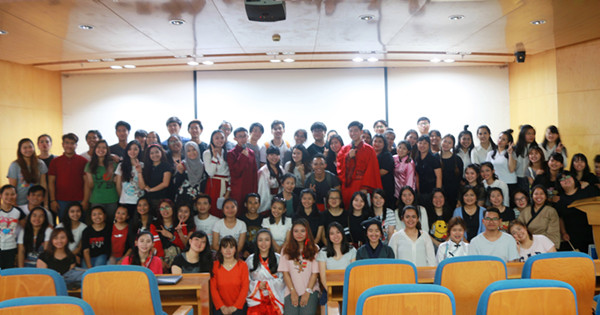 本场诵读表演会节目精彩纷呈,形式多样,既有悦耳动听的《白头吟》《水调歌头》《虞美人——春江花月何时了》等古诗词改编的古风歌曲,又有以生动唯美的音乐短剧演绎的《关雎》爱情,还有创意十足的中国四大名著经典片段重现。在三年级A班同学参演的《西游记》之《三打白骨精》里,来自印尼的魏柳卿将影视剧中的“孙猴子”模仿得活灵活现,由印尼同学马瑞隆等人表演的《娶经女儿国》也是情节跌宕又不失趣味。三年级C班的印尼员工郭荣士和他的同学们用汉语完美演绎的《刘姥姥进大观园》《黛玉葬花》,三年级B班的林康宁、赖安伦等人表演的《三顾茅庐》《草船借箭》以及三年级D班的菲律宾员工施佳妮等人的《武松打虎》等节目都赢得了满堂喝彩。最后,在李商隐的《无题》诗歌演唱声中本次中国古典文学诵读表演会落下帷幕,参演同学与本次活动的组织者——华文教育系系主任夏明菊老师一起拍照留念,共同记录这一美好时刻。