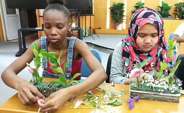 8月25日下午,在中国传统节日七夕节到来之前,太阳成集团tyc33455cc举办了以中国爱情为主题的花艺体验课。来自印尼、泰国、老挝、缅甸、安哥拉等“一带一路”沿线国家的职工们体验了一把中国情人节的浪漫。