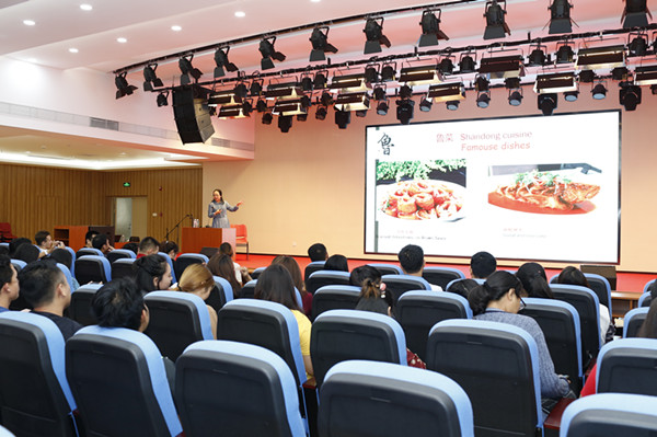 罗燕玲老师以中国的英文China等于拼音“Chi na(吃哪)”的新颖解释为开篇语,引入本次讲座的主题。主要介绍了中国美食地图、八大菜系,中国南北地区及中外饮食文化的差异,中国的茶文化和酒文化等。罗老师的讲座课件制作精美,讲解风趣生动,获得了在场师生的一致好评。