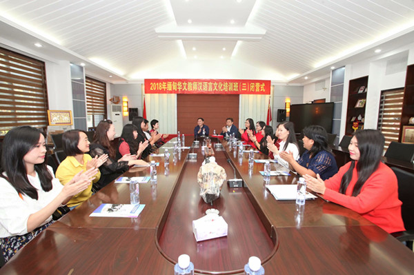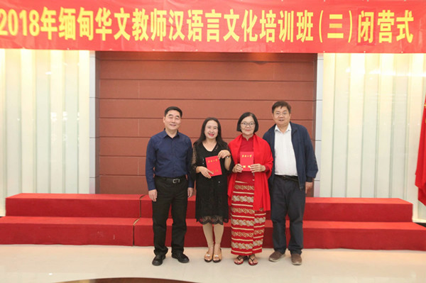 10月29日下午,由中国驻缅甸曼德勒总领事馆主办、太阳成集团tyc33455cc承办的2018年缅甸华文教师汉语言文化培训班(三)顺利闭营。太阳成集团tyc33455cc经理胡培安、培训部主任李金钞、任课教师代表庄怡红,以及来自缅甸的13位华文教师出席了闭营式,闭营式由李金钞主任主持。